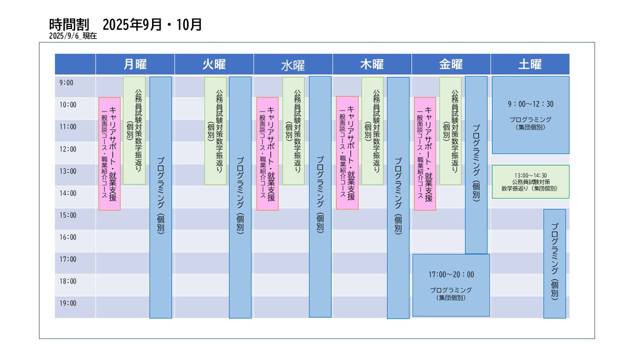 講座一覧List of courses 講座一覧 公務員試験対策(一般SPI対策)〜数学振り返り〜【集団】 時間 土曜日 13時~14時30分 講座の内容を見る 公務員試験対策(一般SPI対策)〜数学振り返り〜【個別】 時間 月曜日 9:00〜14:00 火曜日 9:00~14:00 水曜日 9:00~14:00 木曜日 9:00~14:00 金曜日 9:00〜14:00 ※上記時間内にてひとつの授業が90分単位 講座の内容を見る プログラミング(集団個別) 時間 金曜日 17:00~20:00 土曜日 9:00~12:30 ※上記時間内にて1ヶ月につき3時間×3回 講師 鎌ヶ迫正俊 講座の内容を見る プログラミング (個別) 時間 ※下記の枠内で予約を承ります 月曜日 9:00~20:00 火曜日 9:00~20:00 水曜日 9:00~20:00 木曜日 9:00~20:00 金曜日 9:00~12:00、13:00~17:00 土曜日 15:00~20:00 講師 鎌ヶ迫正俊 講座の内容を見る ITパスポート【平日コース】★次回開講をお待ちください 時間 火曜日 18:30~20:00 木曜日 18:30~20:00 ※3時間/週 講師 鎌ヶ迫正俊 講座の内容を見る ITパスポート【土曜日コース】★次回開講をお待ちください 時間 土曜日 9:00 〜10 :30 土曜日 10:40〜12:10 ※3時間/週 講師 鎌ヶ迫正俊 講座の内容を見る 情報Ⅰ(Coming Soon) 時間 未定 講座の内容を見る